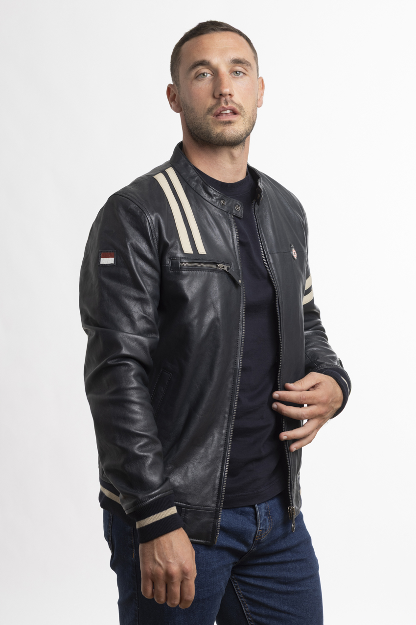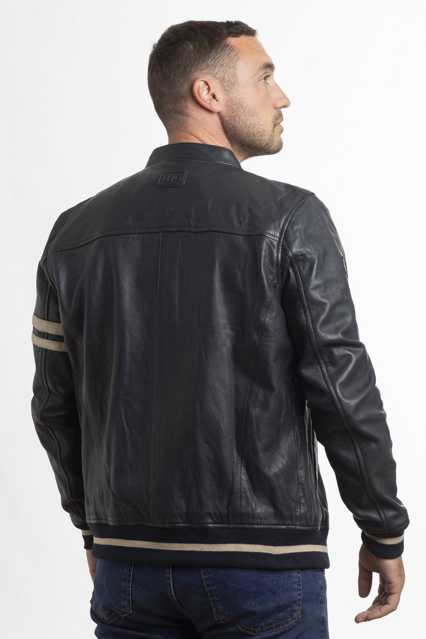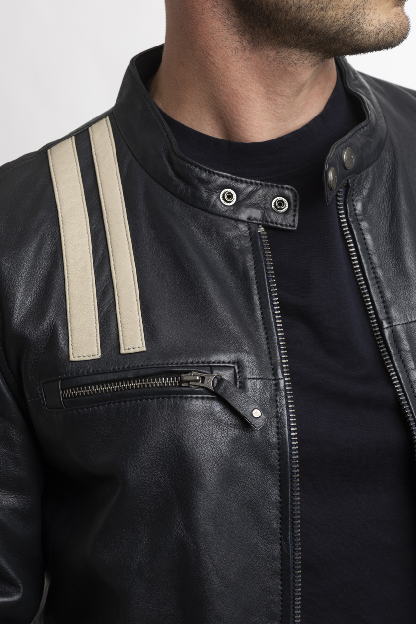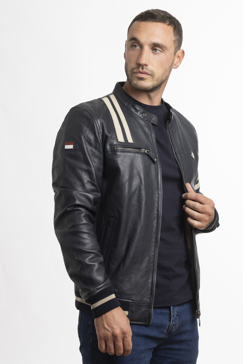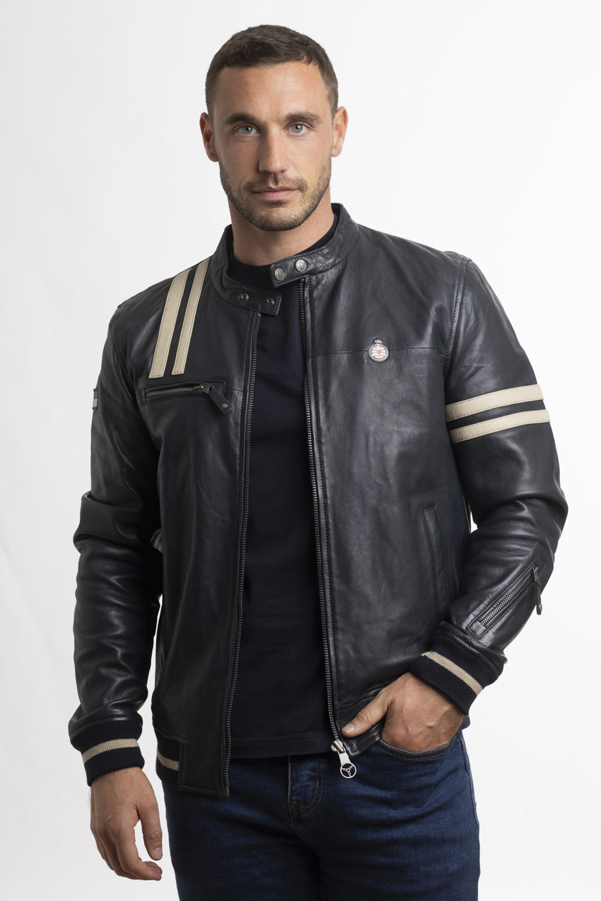 The jacket combines contemporary, urban and sporty styling. The jacket features a short cut with a high collar fastened by a button, a central metal zip with a customised pull tab and two outside side pockets. It features the Automobile Club de Monaco crest woven in high definition on the left sleeve and a piece of ‘1890’ leather on the right sleeve, making it a beautiful warm leather jacket.