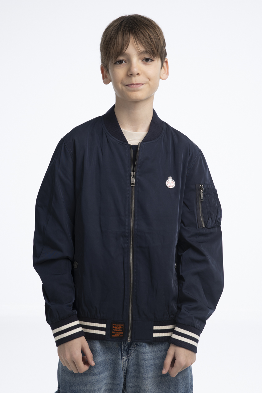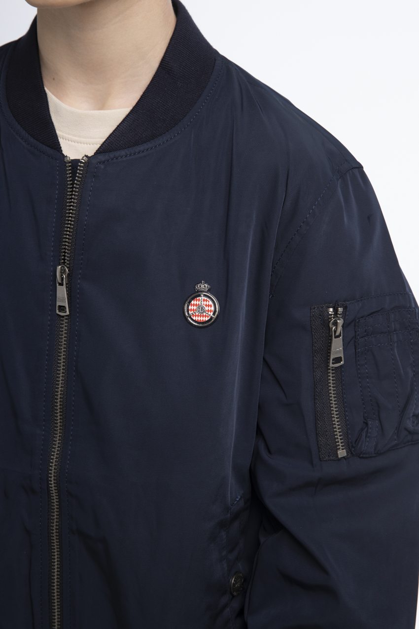The bomber jacket combines urban and sporty style. This navy blue bomber stands out with its short cut, high blue collar, central metal zip fastening with a custom puller, and two external side pockets. It features a high-definition woven patch of the Automobile Club de Monaco on the left chest, along with a zippered pocket on the right sleeve. Crafted from warm and comfortable fabric, this bomber also includes an official woven label on the inside.