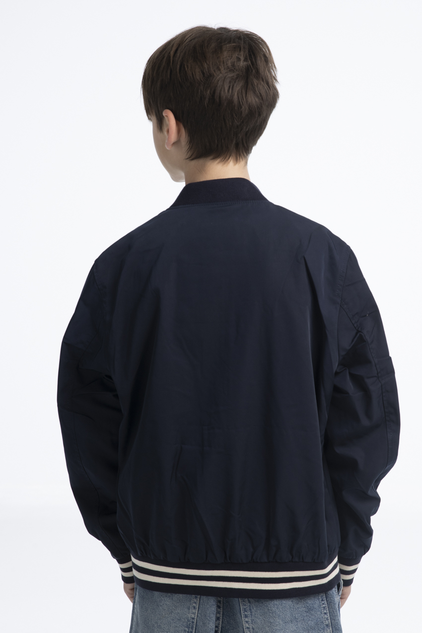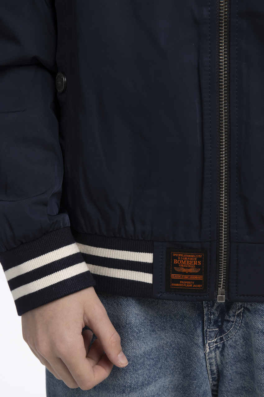 Its high-quality, durable finishes enhance comfort, particularly at the cuffs and hem, which are detailed with blue and white stripes. This bomber pairs perfectly with jeans for a relaxed, sporty-chic look.