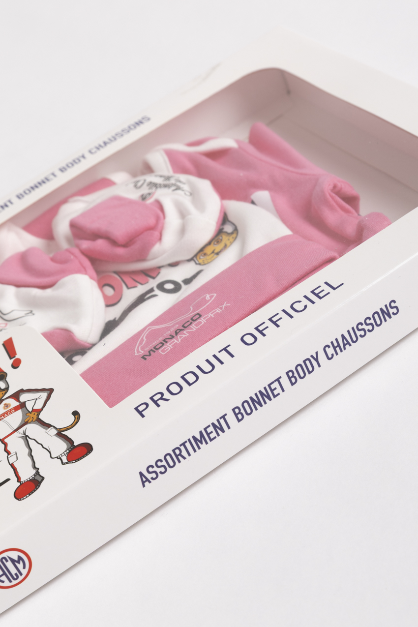 Girl’s newborn gift set « Automobile Club de Monaco ». Entirely made from 100% cotton, this official set accompanies little ones with comfort and softness. It includes a pink short-sleeve bodysuit, a matching bonnet and a pair of booties.