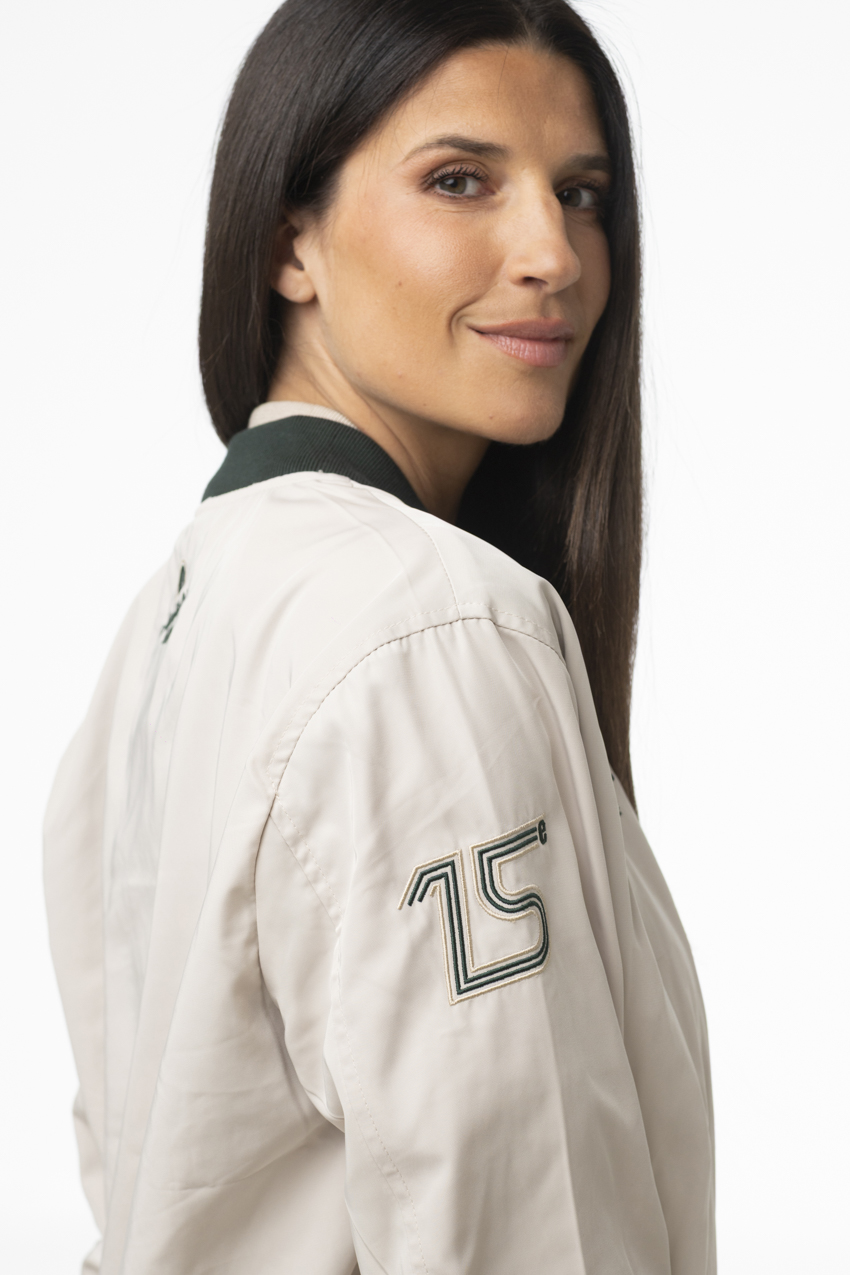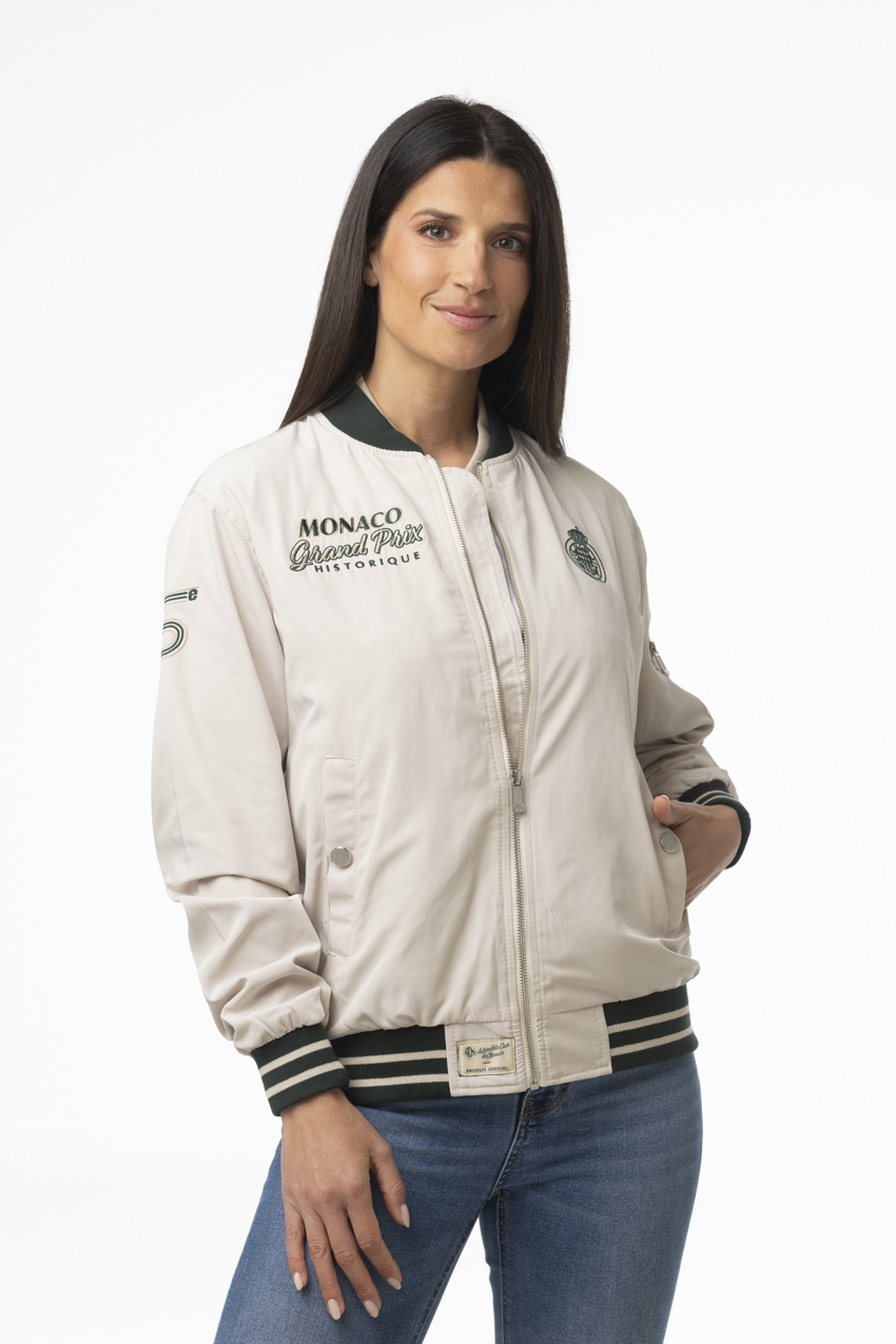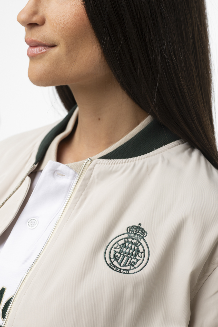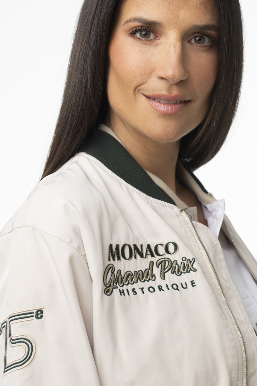Zipped jacket from the Monaco Grand Prix Historique collection, inspired by the racing universe with a clearly defined sport-chic look. Its bright beige color is enhanced by contrasting dark green finishes at the collar, cuffs and waist, adding character and modernity. The chest and sleeve embroidery, featuring the signature “Monaco Grand Prix Historique” and the crest, strengthens its iconic identity.