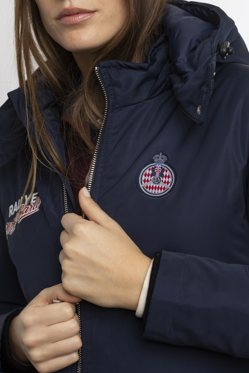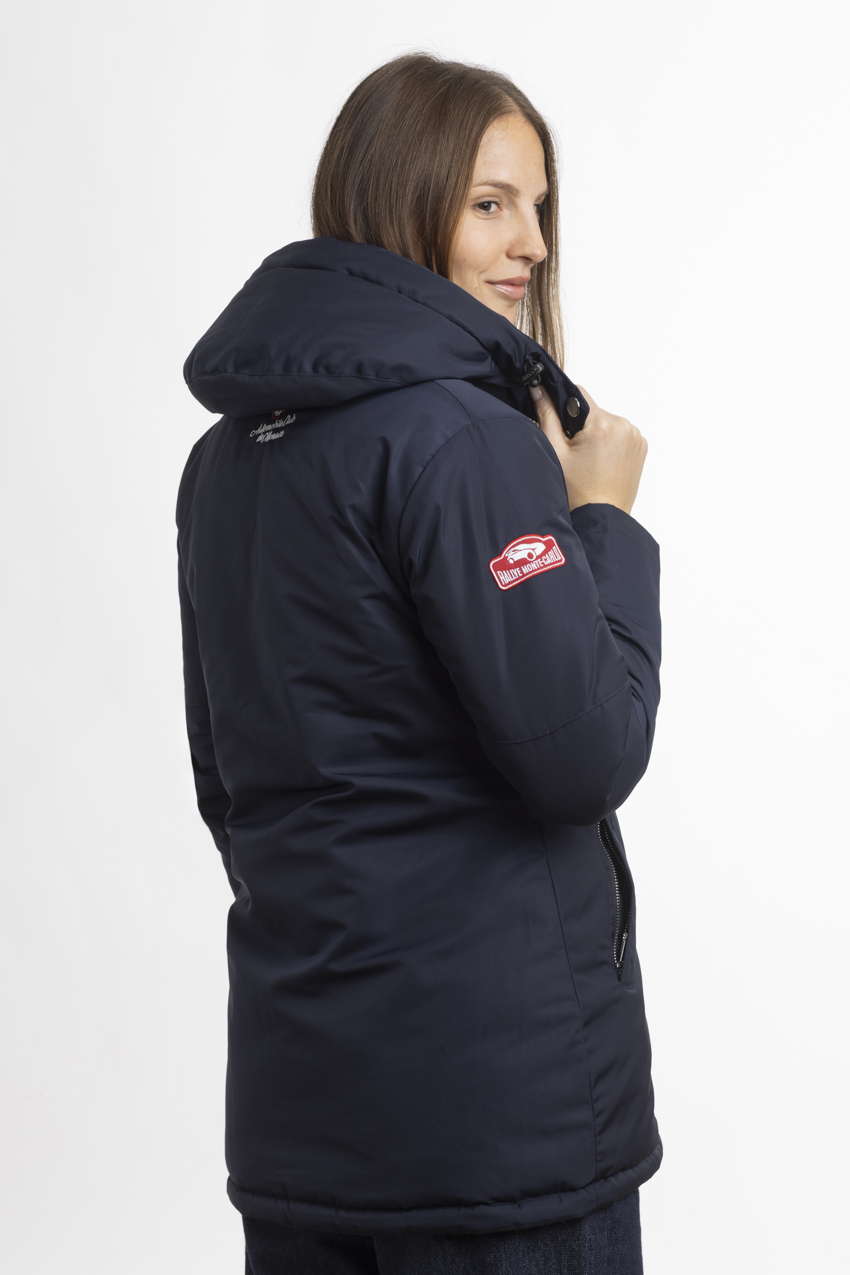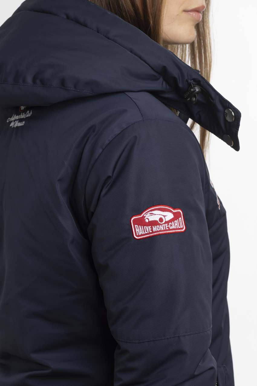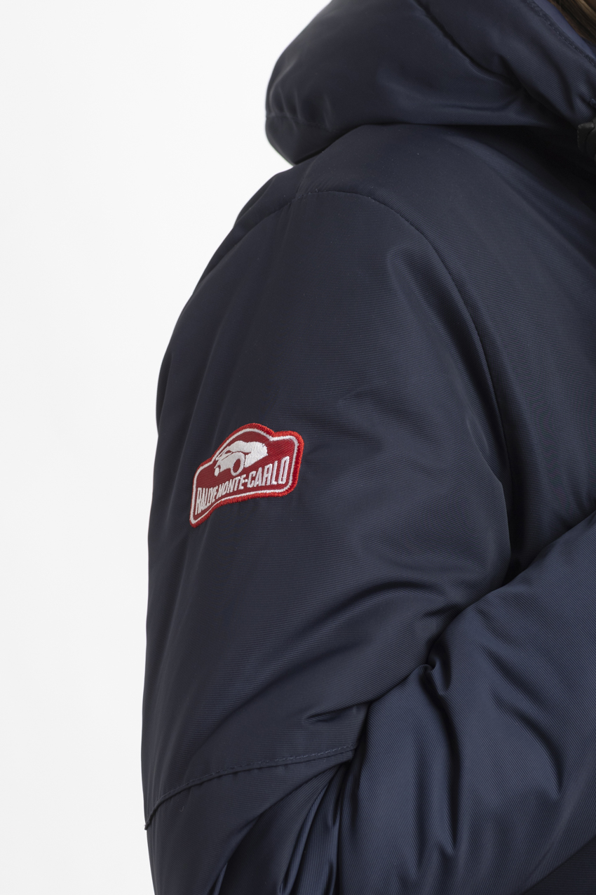 Exclusive navy blue parka, adorned with embroideries from the Rallye Monte‑Carlo.