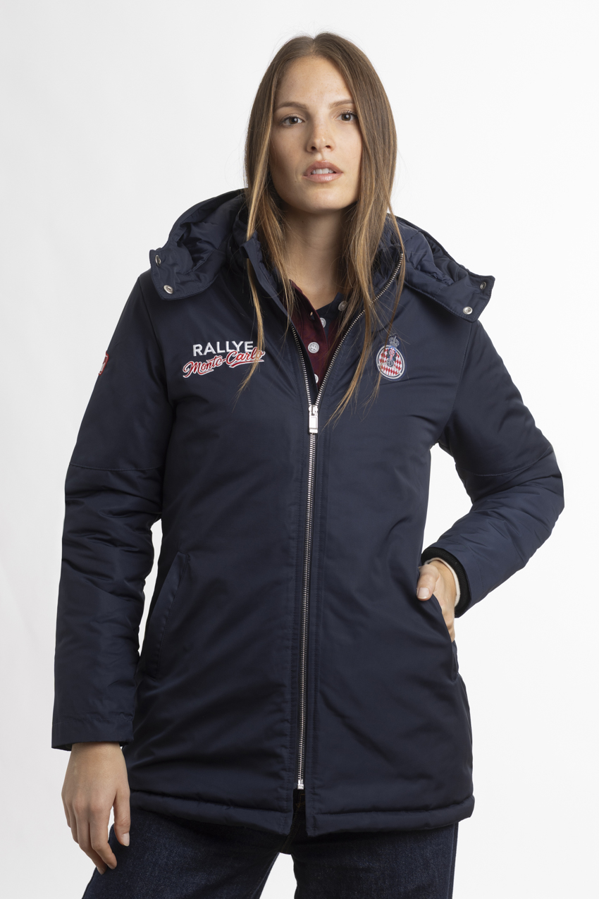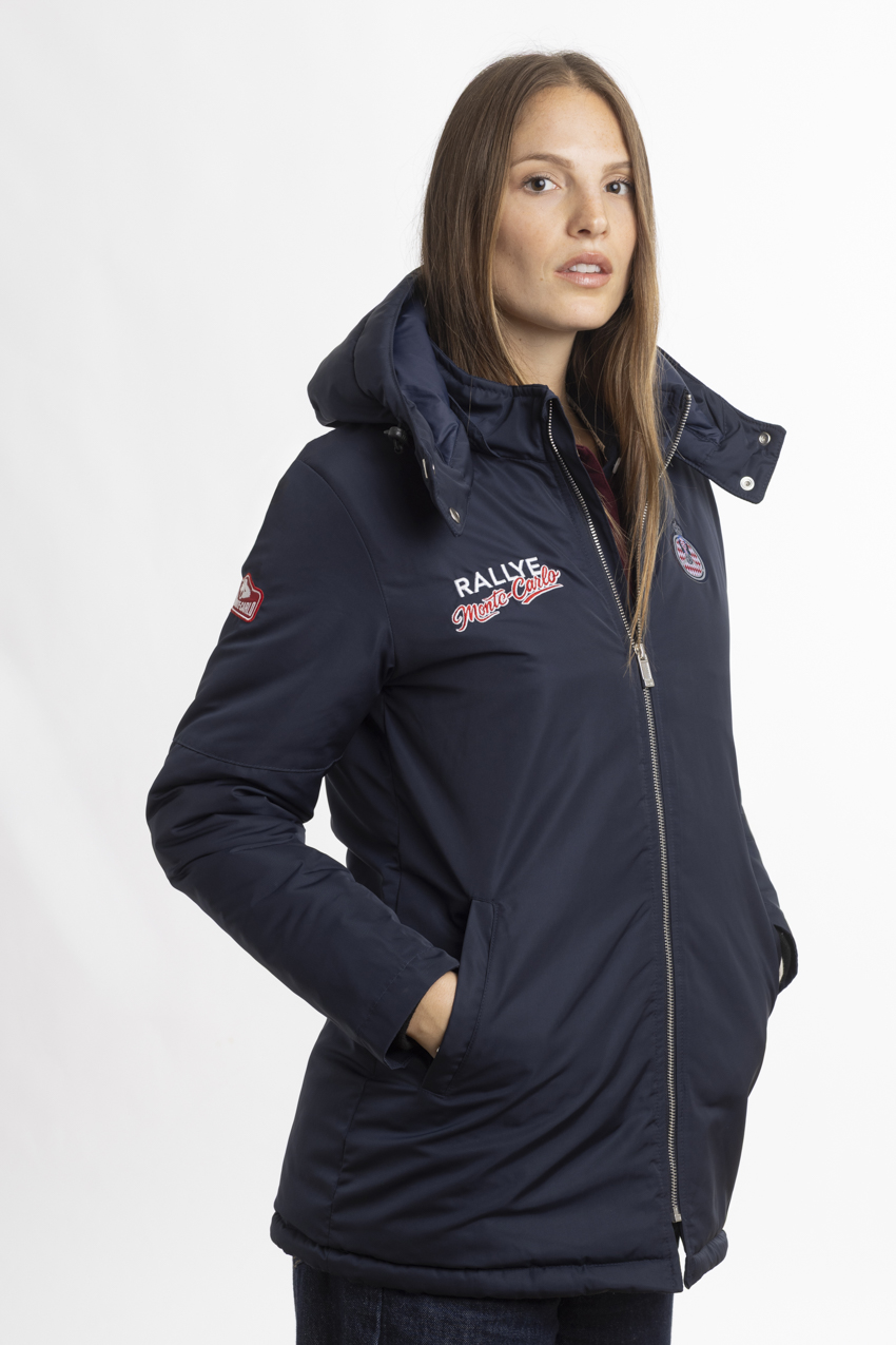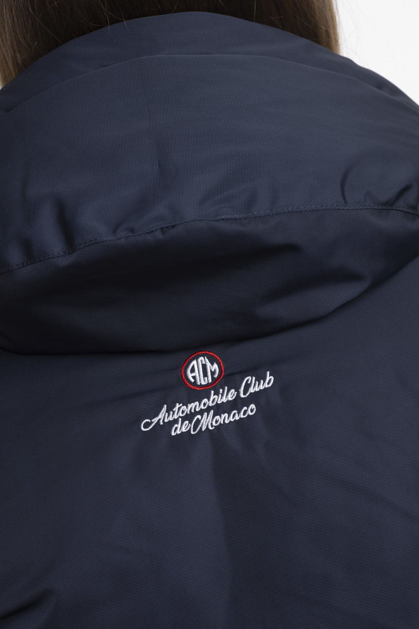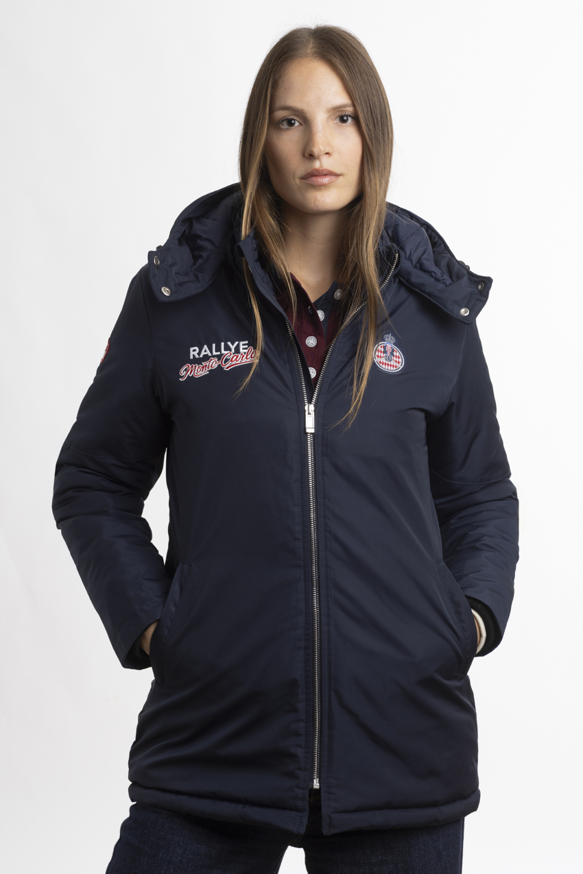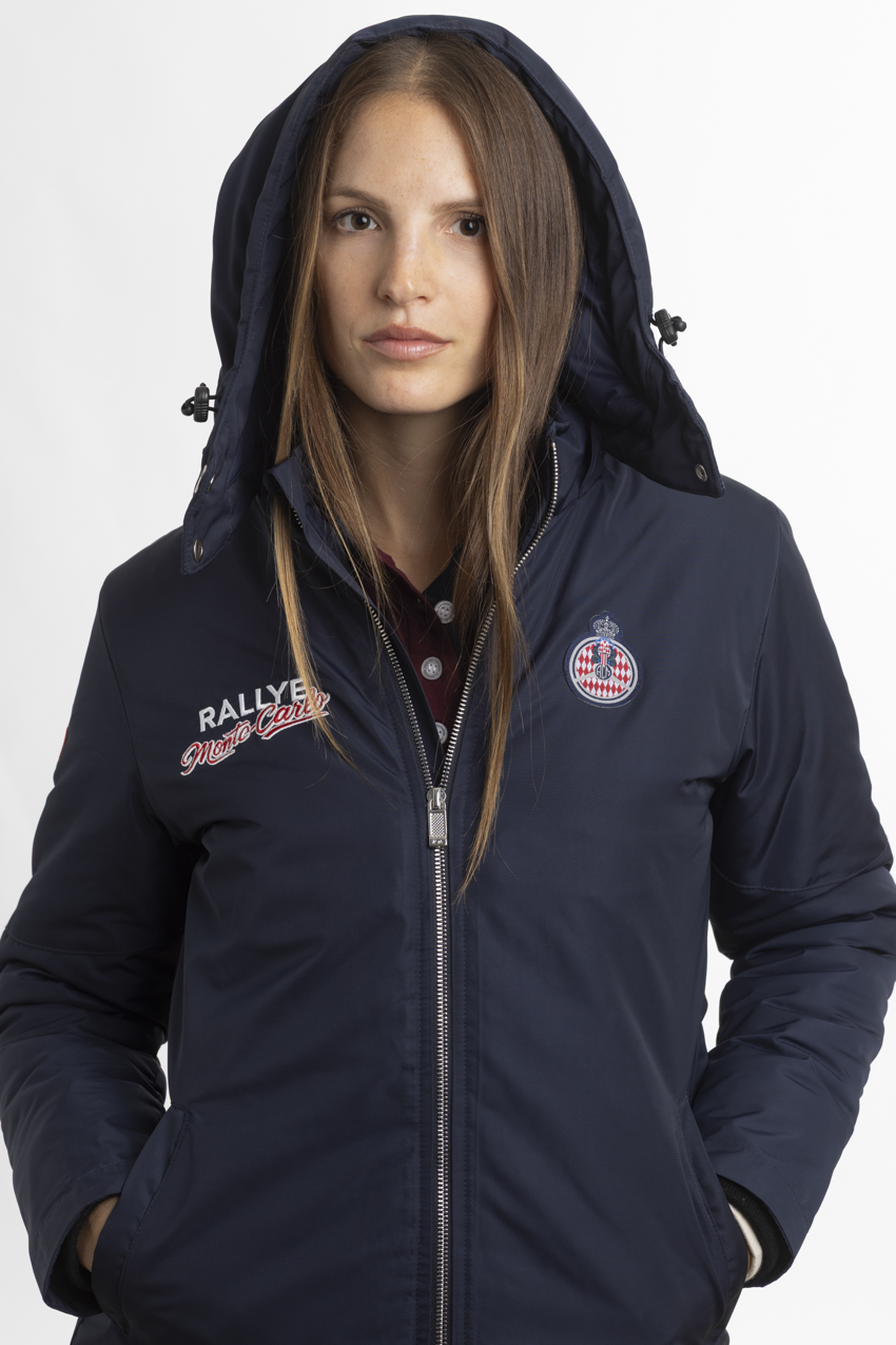 Exclusive navy blue parka, adorned with embroideries from the Rallye Monte‑Carlo.