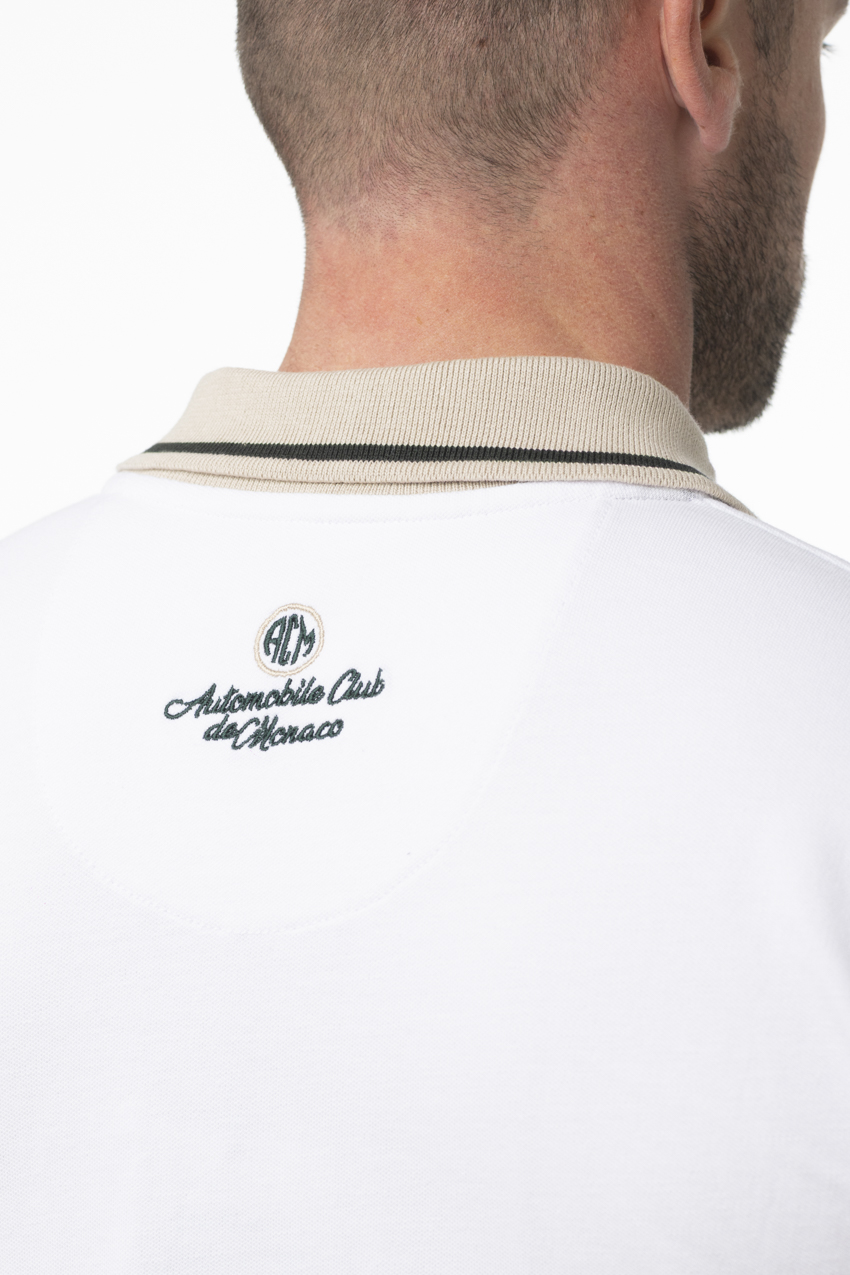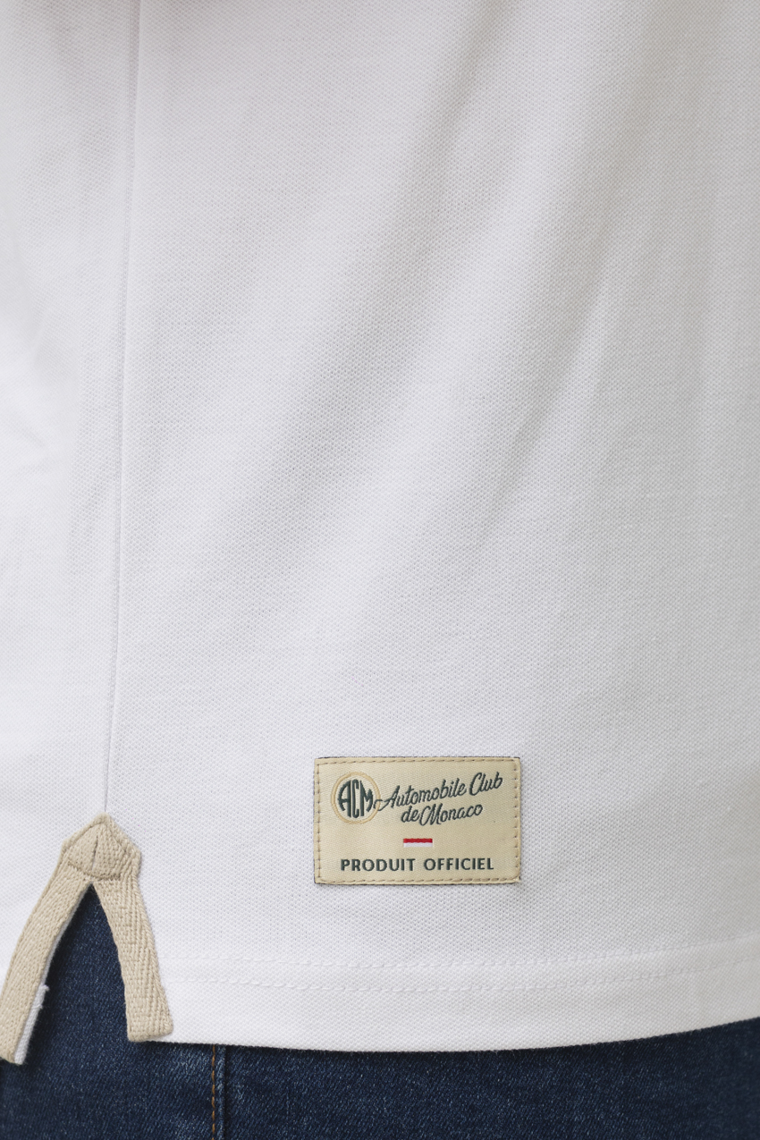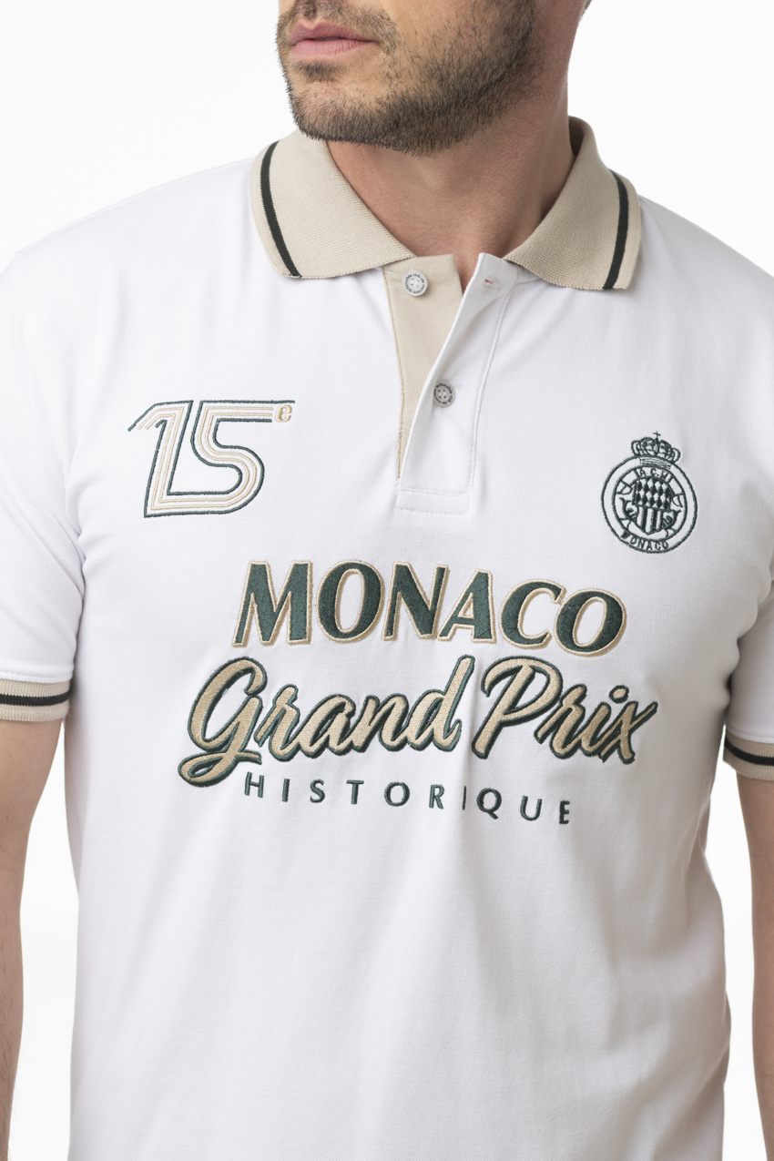 Polo of the Monaco Historic Grand Prix with a refined and luminous style. Crafted in a white color with contrasting beige and green details, it blends elegance with a vintage racing spirit. The “Monaco Grand Prix Historique” marking on the chest, along with the number 15 and the Automobile Club de Monaco crest, highlights its authentic character. Made from mercerized cotton, it offers softness, comfort, and a slightly satin finish.