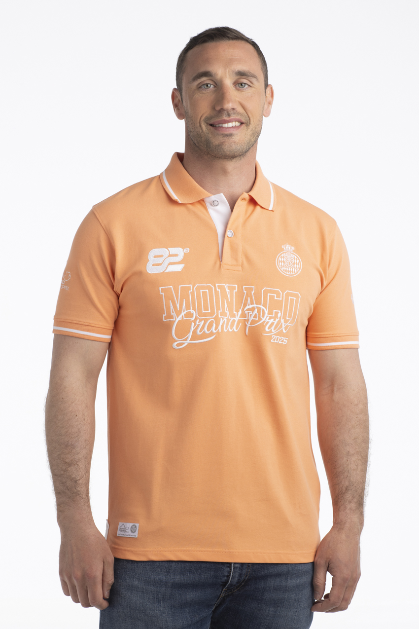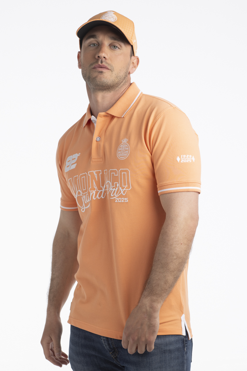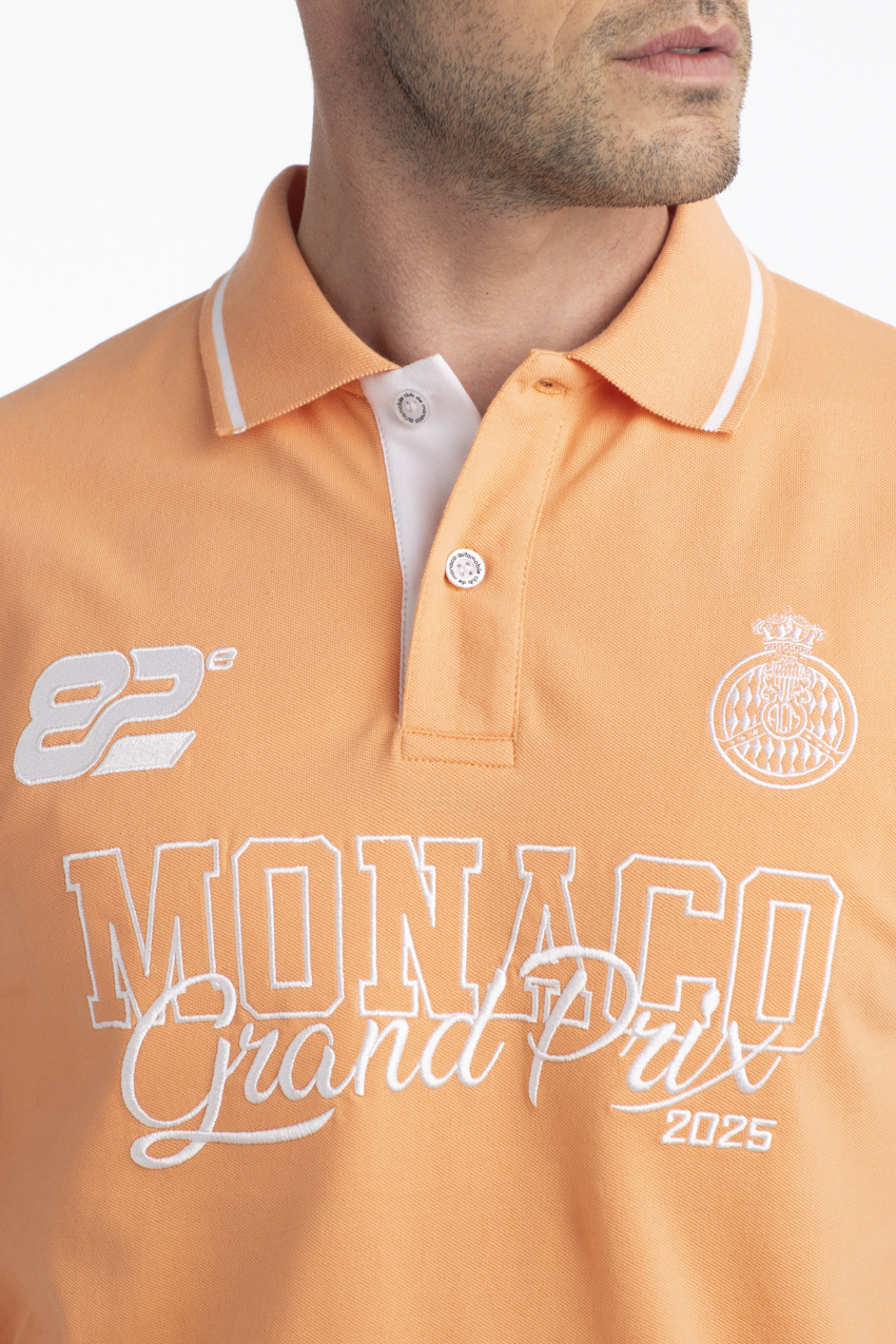 Exclusive orange cotton polo shirt adorned with embroideries of the 82nd edition of the Monaco Grand Prix