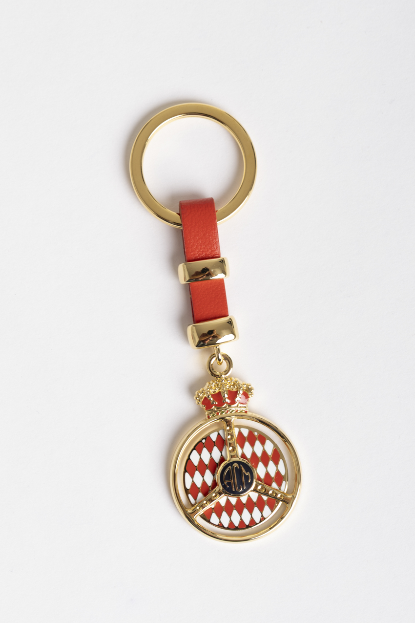 This iconic keychain proudly displays the colors and crest of the Automobile Club de Monaco. Its refined design combines elegance with a sporty spirit, featuring a shiny gold finish, vibrant red leather, and an enameled shield with the Principality’s signature diamond pattern. Both a chic accessory and a prestigious keepsake, it’s perfect for holding your keys or enhancing a bag with a touch of motorsport passion.