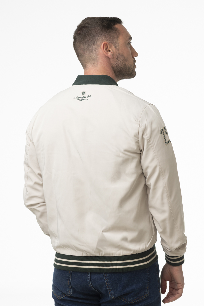 Zipped bomber from the Monaco Grand Prix Historique collection, inspired by the racing world with a contemporary touch. Its elegant beige color is contrasted by dark green finishes at the collar, cuffs and waist, highlighted with stripes for a bold sporty spirit. The chest embroidery and crest add a distinctive signature.