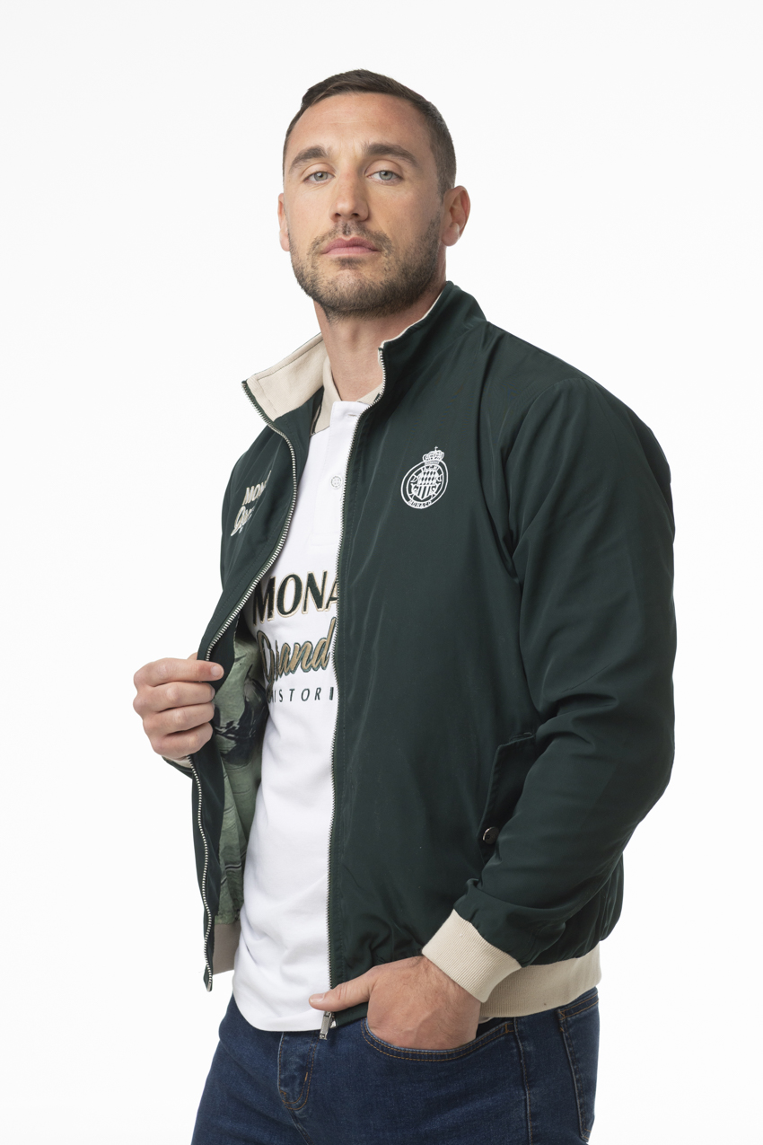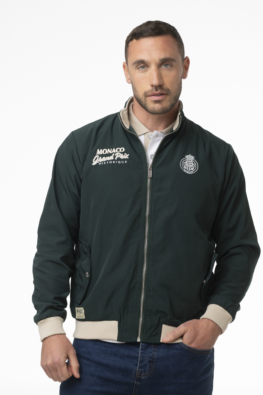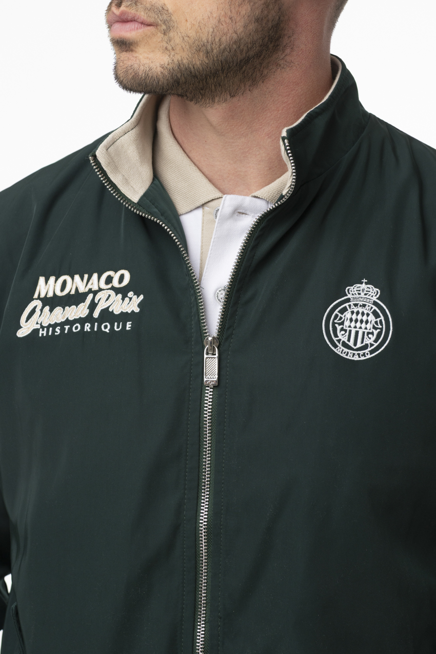 Zipped jacket from the Monaco Grand Prix Historique collection, with a timeless racing style. Its deep green color is enhanced by contrasting beige finishes at the collar, cuffs and waist, for an elegant yet sporty look. The chest embroidery, with the signature “Monaco Grand Prix Historique” and the crest, reinforces its iconic identity.