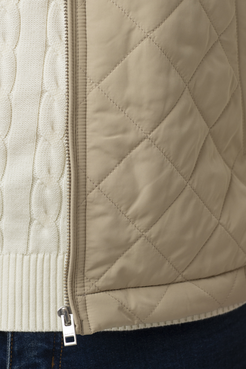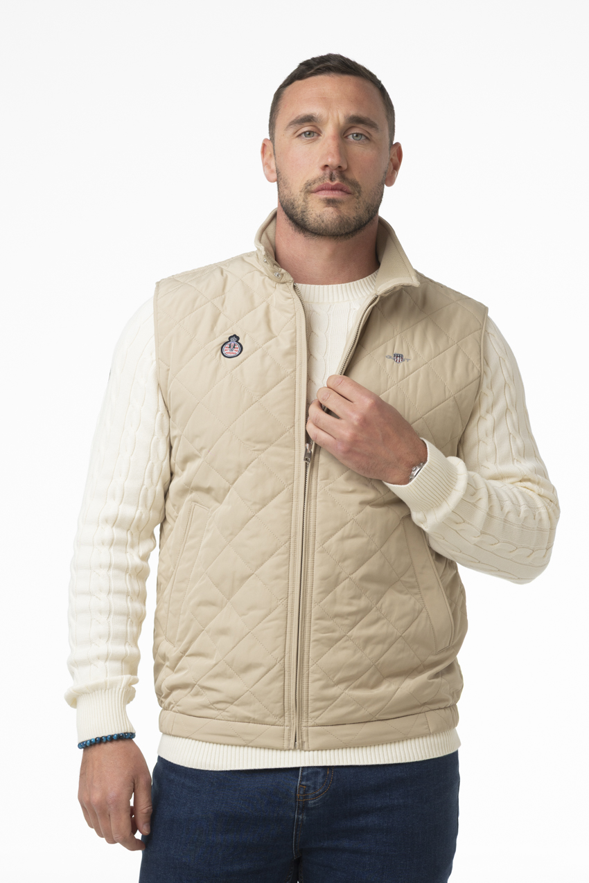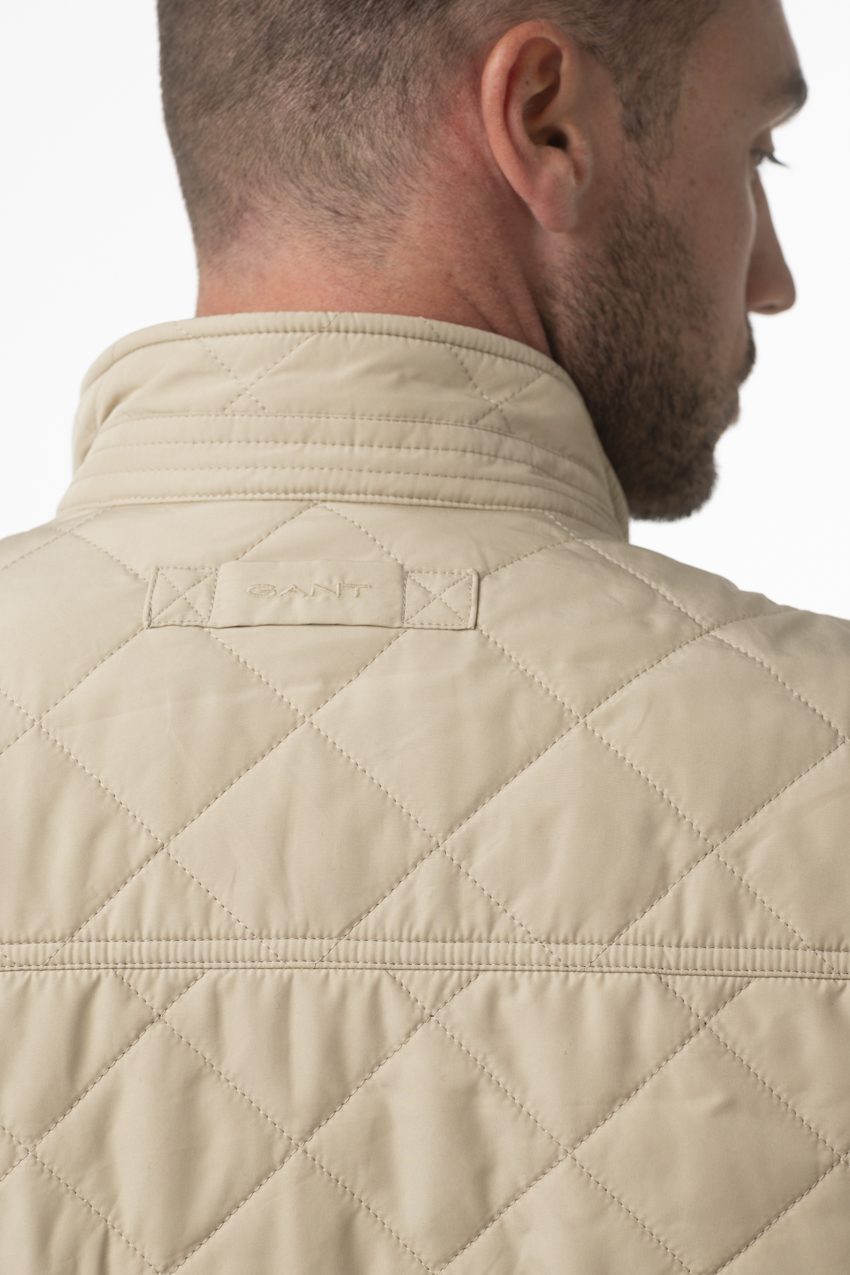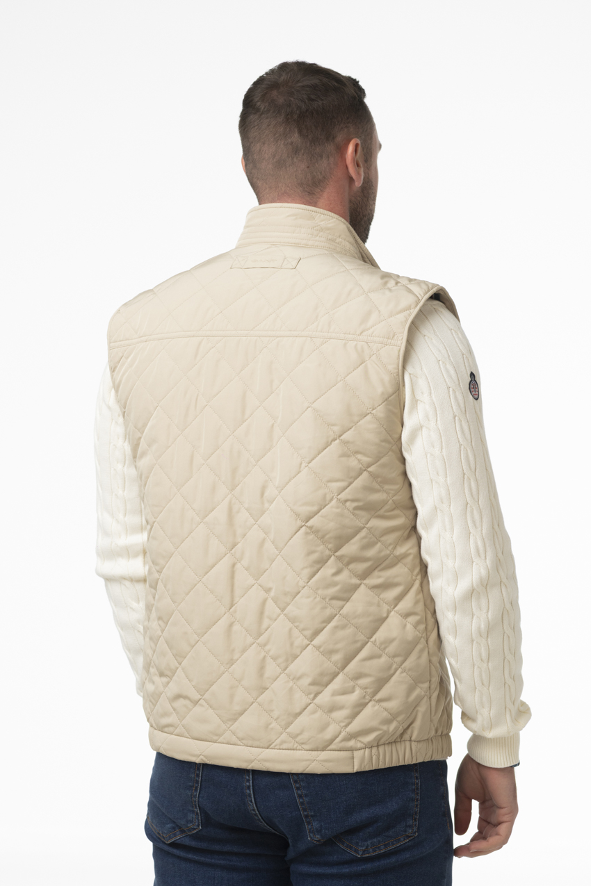 Sleeveless jacket from the Automobile Club de Monaco collection in collaboration with GANT, featuring a style that is both modern and functional. Designed in an elegant and luminous beige color, it stands out with its diamond quilting that adds texture and a sophisticated touch to the overall look. Its stand collar combined with a full zip closure provides effective protection against the wind while offering great freedom of movement.