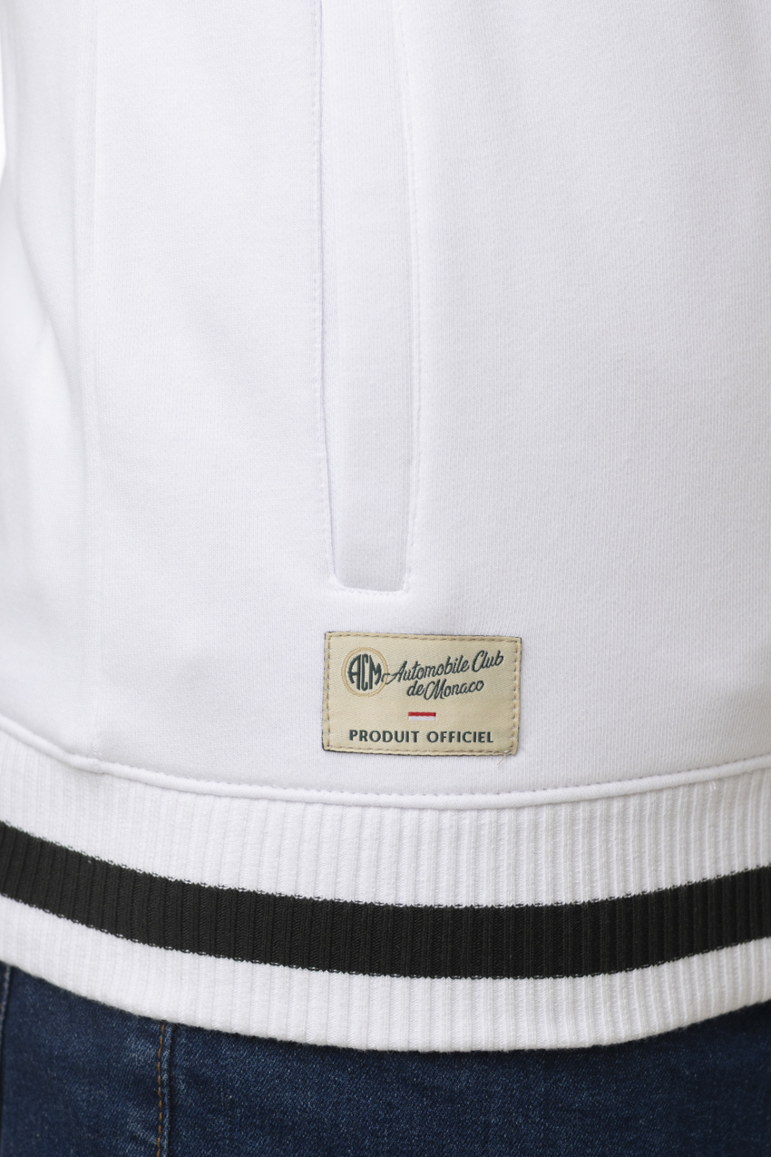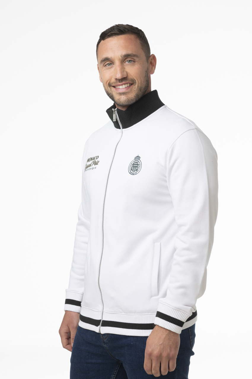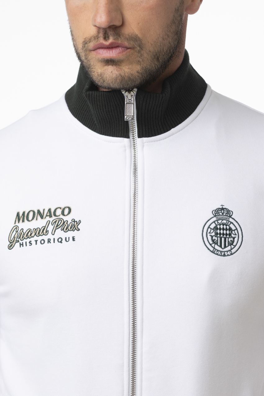 Cardigan issu de la collection Monaco Grand Prix Historique, au style sport chic inspiré de l’univers automobile. Son coloris blanc lumineux est sublimé par des finitions contrastées noires au col, aux poignets et à la taille, apportant du relief et du caractère à la pièce. Les broderies poitrine, dont la signature “Monaco Grand Prix Historique” et l’écusson, renforcent son identité élégante et distinctive.