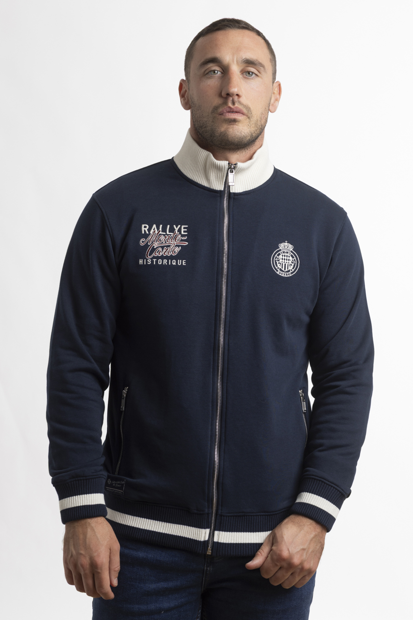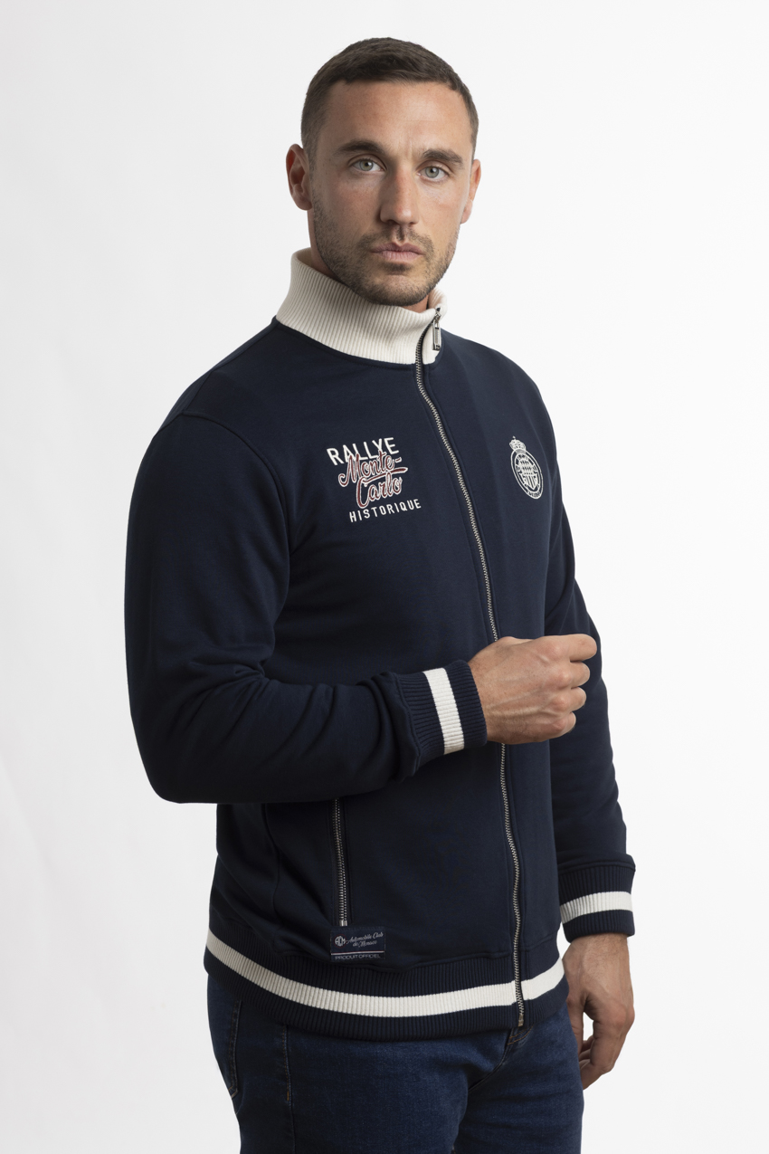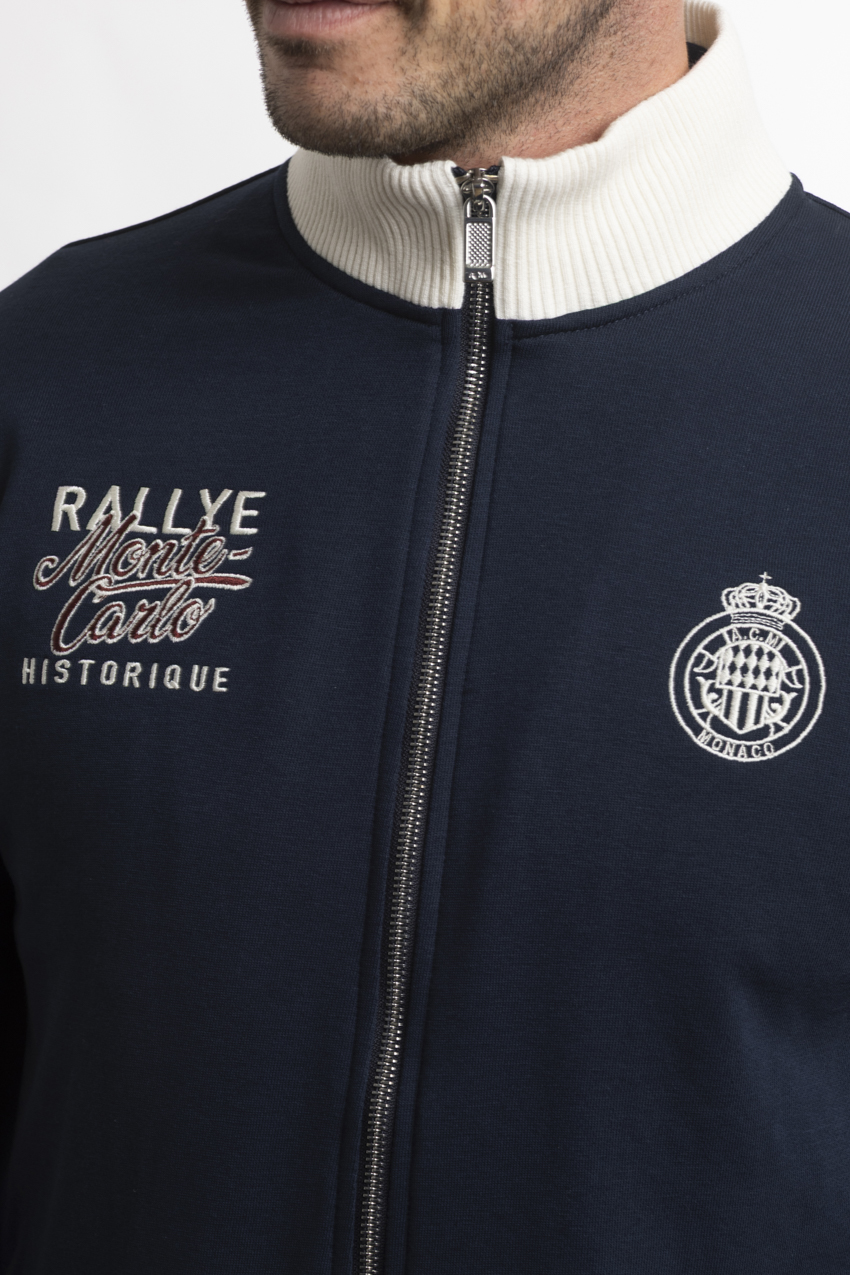 Cardigan Rallye Monte-Carlo Historique. Conçu en coton 70 % et polyester 30 %, ce cardigan zippé offre un confort doux et une excellente tenue. Son design bleu marine est sublimé par un col montant en maille écru, apportant une touche vintage inspirée de l’univers du Rallye Historique. Les broderies officielles « Rallye Monte-Carlo Historique » et « Automobile Club de Monaco » renforcent son authenticité. Doté de poches zippées et de finitions en bord-côte contrasté, ce modèle allie style, chaleur et praticité. Un incontournable pour les passionnés en quête d’un look sportif et élégant.