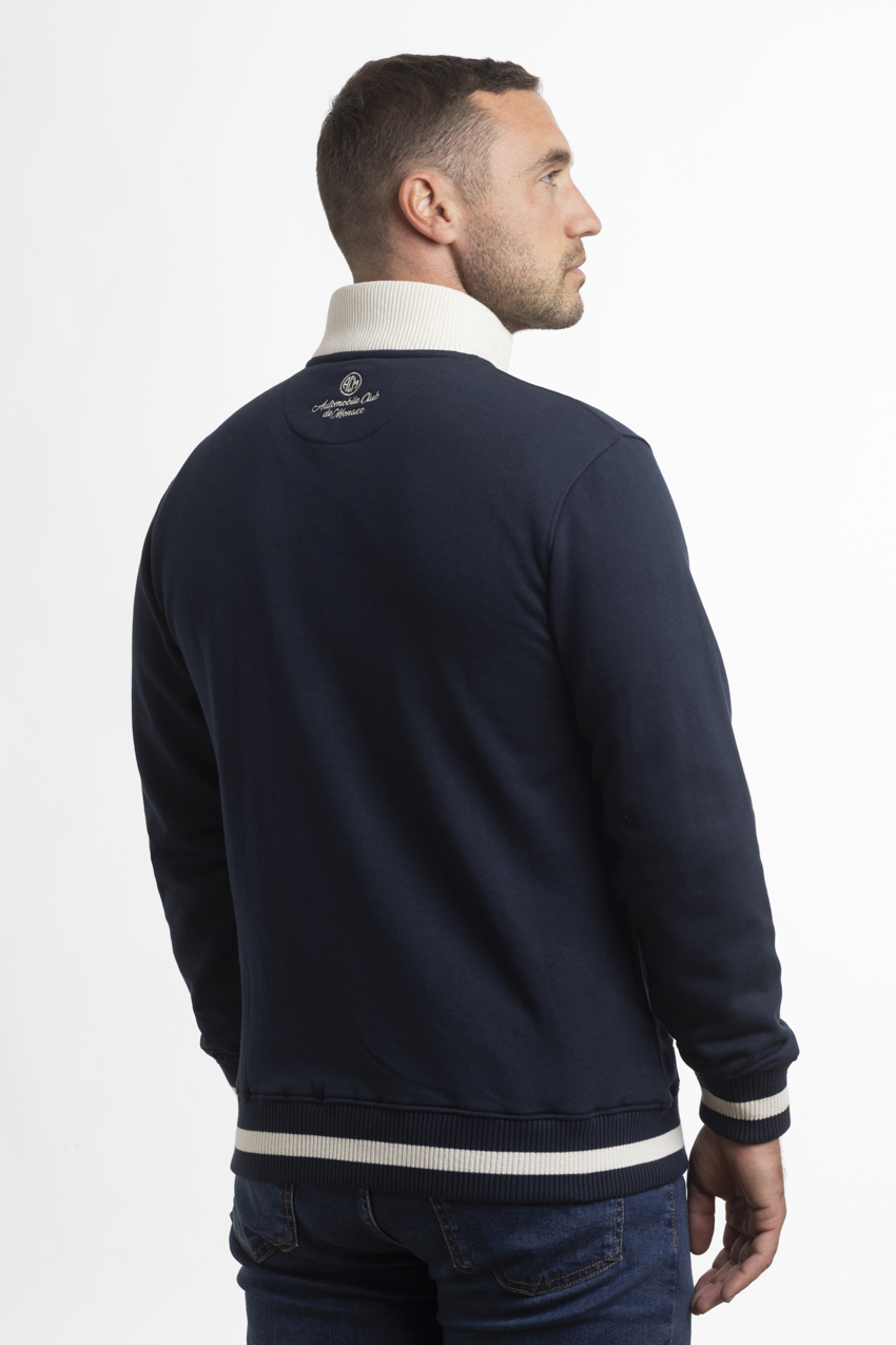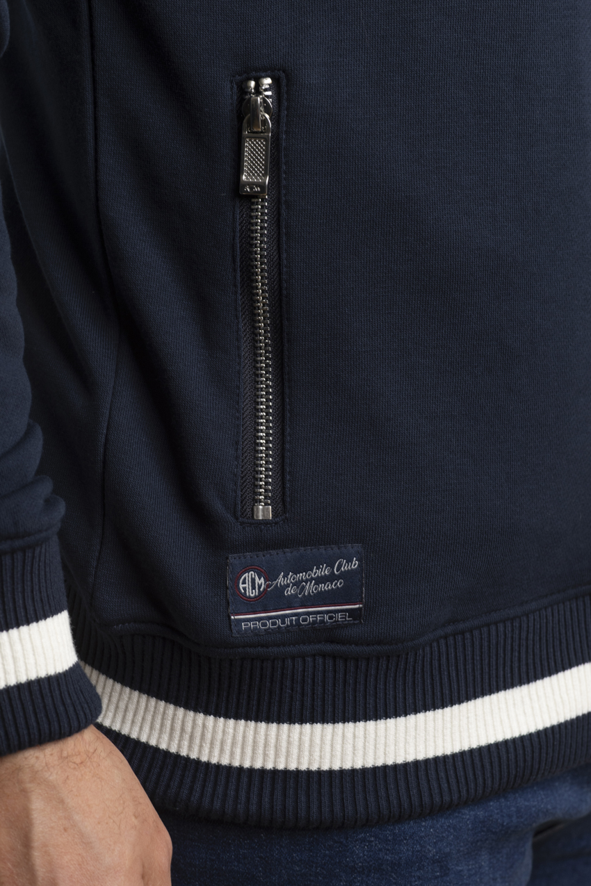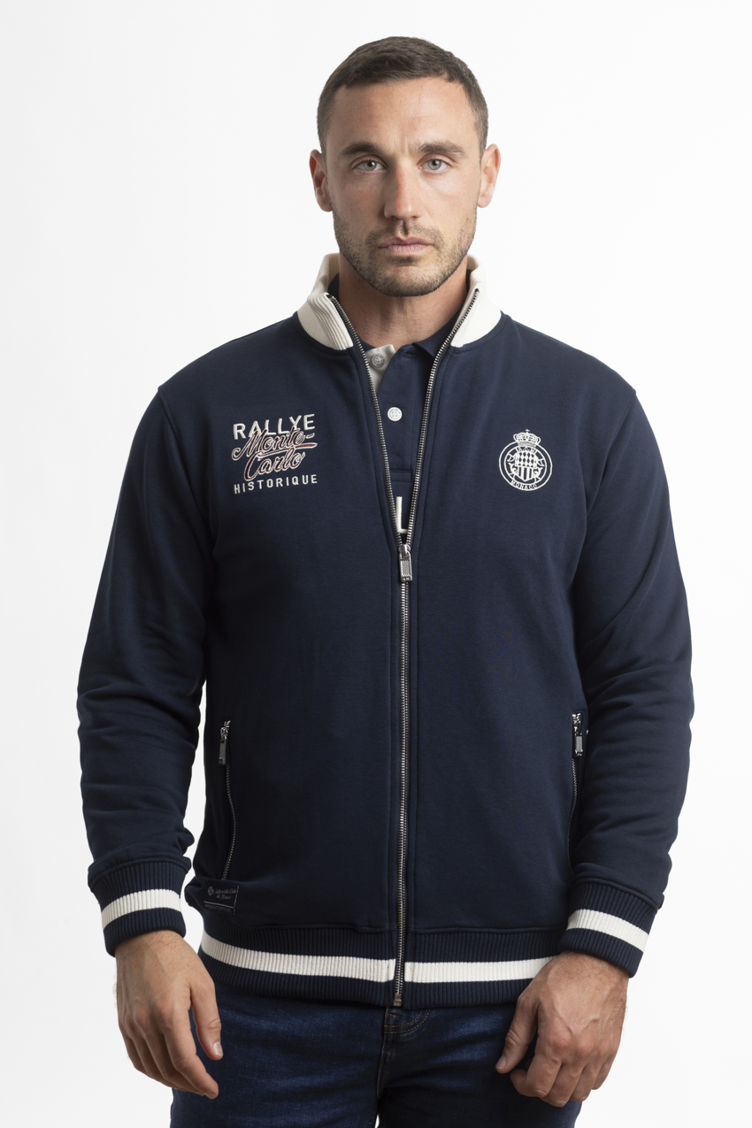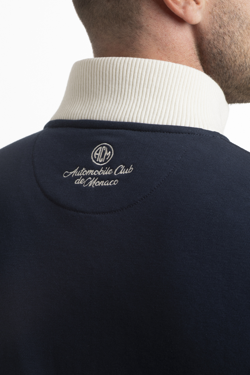 Cardigan Rallye Monte-Carlo Historique. Conçu en coton 70 % et polyester 30 %, ce cardigan zippé offre un confort doux et une excellente tenue. Son design bleu marine est sublimé par un col montant en maille écru, apportant une touche vintage inspirée de l’univers du Rallye Historique. Les broderies officielles « Rallye Monte-Carlo Historique » et « Automobile Club de Monaco » renforcent son authenticité. Doté de poches zippées et de finitions en bord-côte contrasté, ce modèle allie style, chaleur et praticité. Un incontournable pour les passionnés en quête d’un look sportif et élégant.