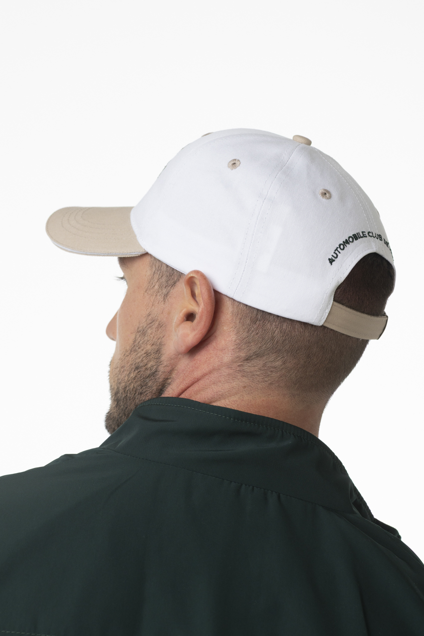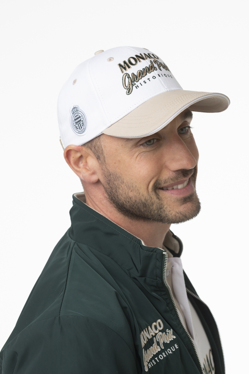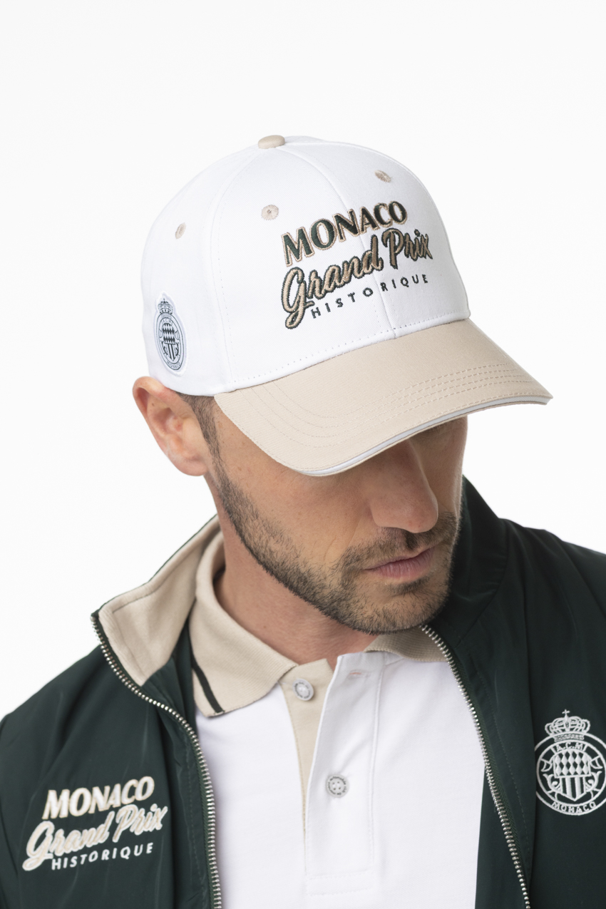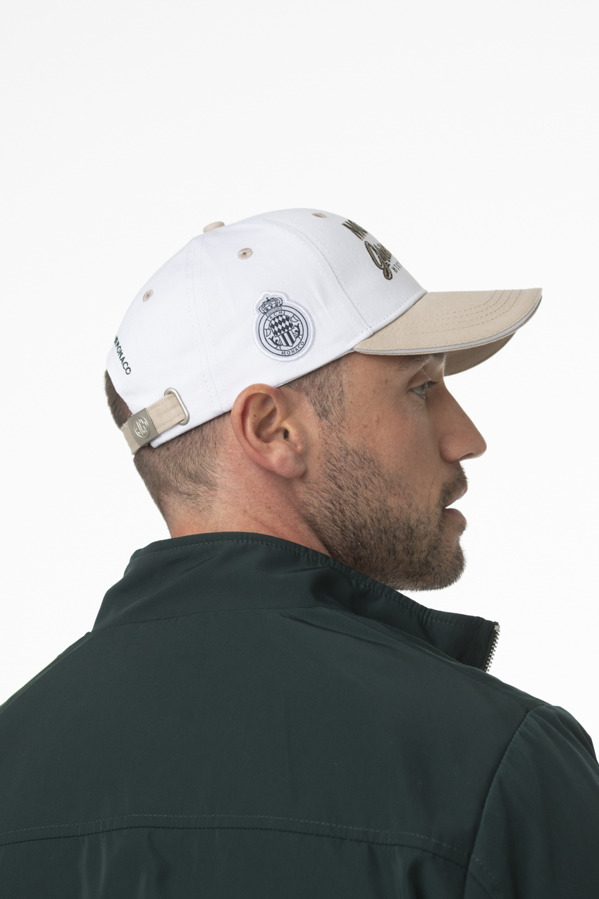 Son coloris blanc contrasté par une visière beige apporte une touche raffinée, tandis que les broderies « Monaco Grand Prix Historique » à l’avant et l’écusson sur le côté renforcent son identité racing. La sangle ajustable à boucle métallique assure un maintien parfait et une finition premium.