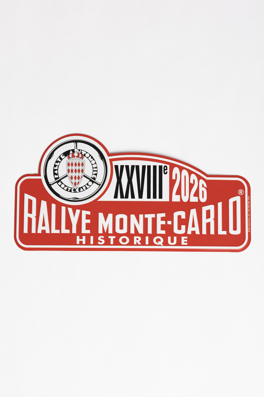 Plaque de métal rouge et blanche imitant celles qui décorent les voitures de courses. À l’origine pour afficher les numéros des bolides, la « Plaque Rallye Historique » est devenue l’objet mythique pour les collectionneurs qui permet de célébrer le Rallye Monte-Carlo Historique.