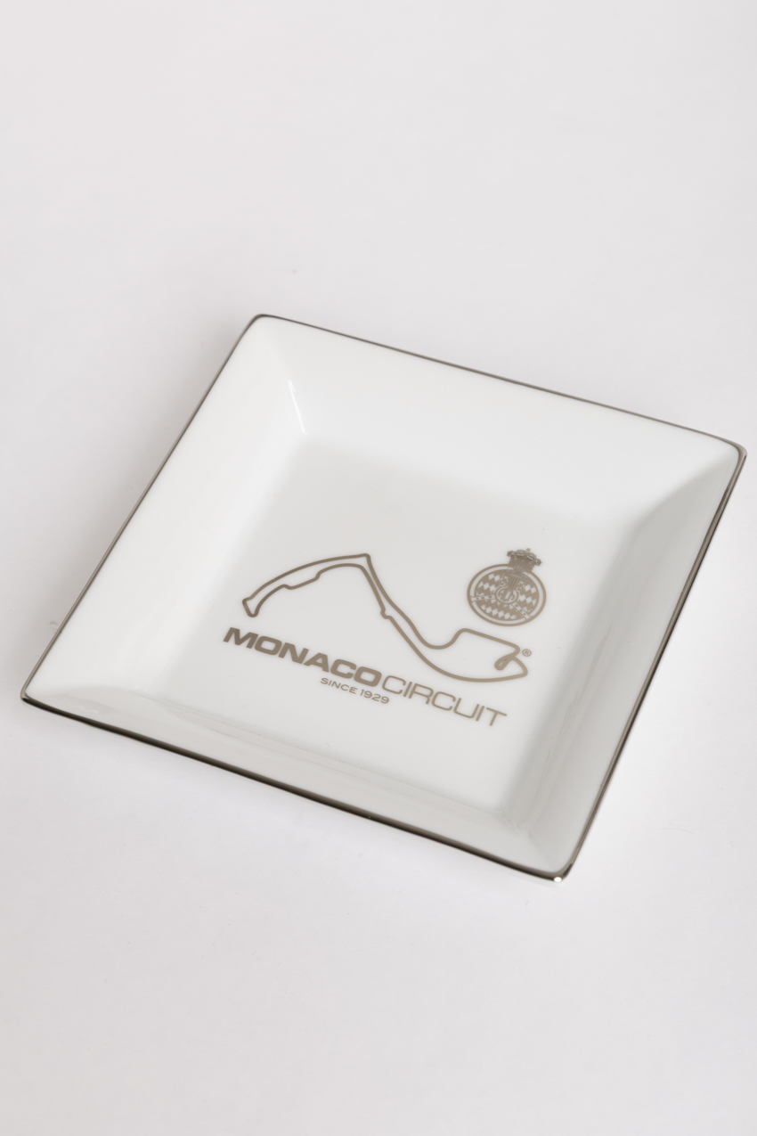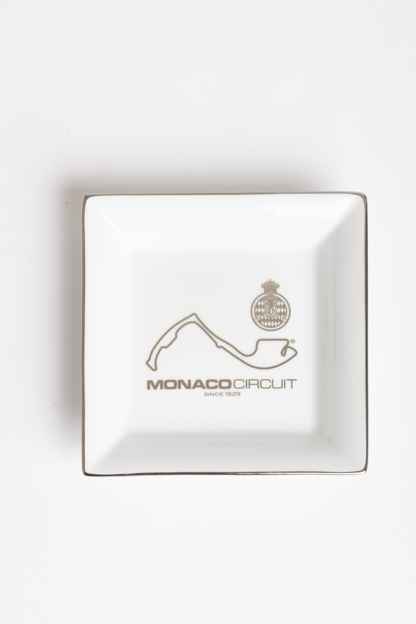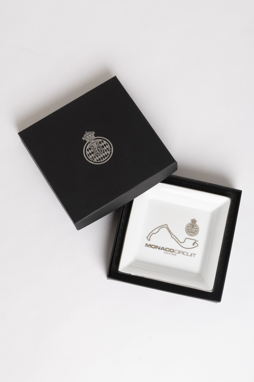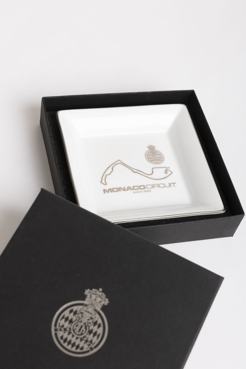 Élégant vide-poche en porcelaine blanche, orné du tracé iconique du Circuit de Monaco et de l’emblème de l’Automobile Club de Monaco dans une finition dorée raffinée. Présenté dans un coffret noir premium siglé ACM, il constitue un objet décoratif chic et un souvenir emblématique du célèbre circuit monégasque.